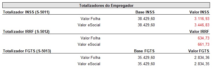 Em seguida, será demonstrado o relatório desejado com seus devidos totalizadores para INSS, IRRF e FGTS, podendo ainda destacar na cor vermelha os valores os quais seus cálculos estão divergentes entre o valor da Folha de Pagamento em comparação com o valor do E-social.