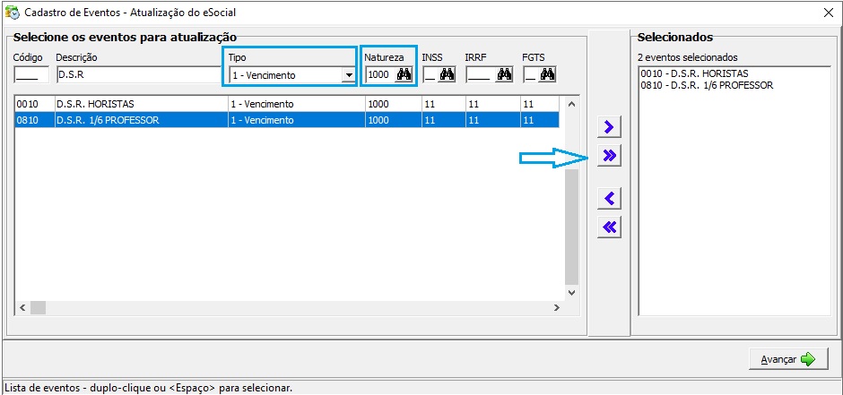 Segundo Passo: Faça a pesquisa no filtro por descrição D.S.R. e selecione o tipo 1-Vencimento.
